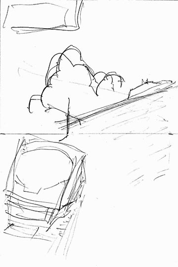 大体頭の中にイメージが出来上がったら、もうちょっと具体的に絵にします。 ただ、まだラフの段階ですので、あまり細かい描写やアスペクトは無視しています。 大体、こんな感じかな〜。