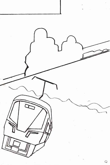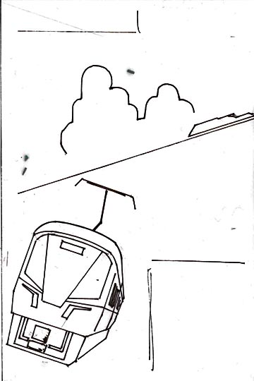 電車を傾けた構図にする、というのは問題なく当初から決めていたのですが。 海をどっちに傾けるか、はちょっとだけ迷いました。 こっちの方が自然な感じがします。 但し面白味には欠ける気がする。 今回は、ちょっとお遊びで、こちらは止めて上の案に決定です。