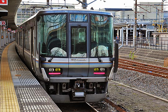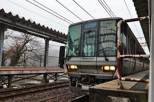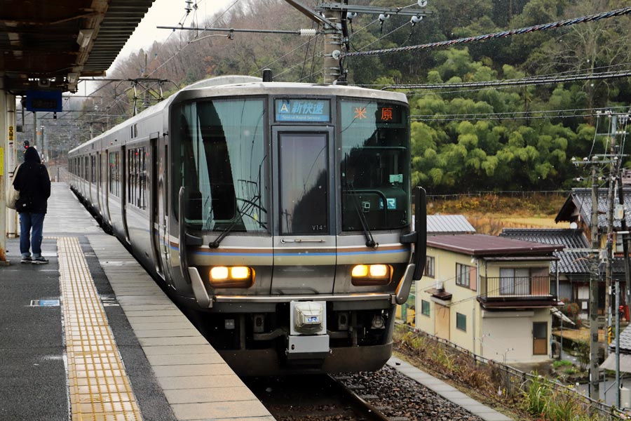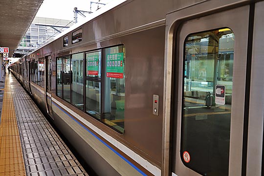 223系。 新快速の223系。 4両から12両への乗り換えですし、米原からそれほど混むことはありませんから、まだガラガラ状態。 なのですが、本日は運用変更で出庫してきたばかりなのか、暖房が全く効いておらず、寒い車内です。 お客が入れば多少は違うのでしょうが、少しは配慮いただきたいと思った、本日の寒さです。