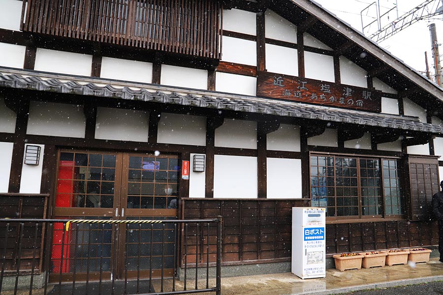 近江塩津。 古い造りの近江塩津駅です。 一旦外に出てみましtが、それほどではないとは言え、またボタン雪がパラついてきました。 4両編成の新快速は満員と言う程ではありませんでしたが、この駅で意外と乗り換え客が多く、寒いので駅舎の中は乗り換え客で一杯です。 大阪よりも、米原から岐阜名古屋方面へのお客の方が多いのでしょうか。