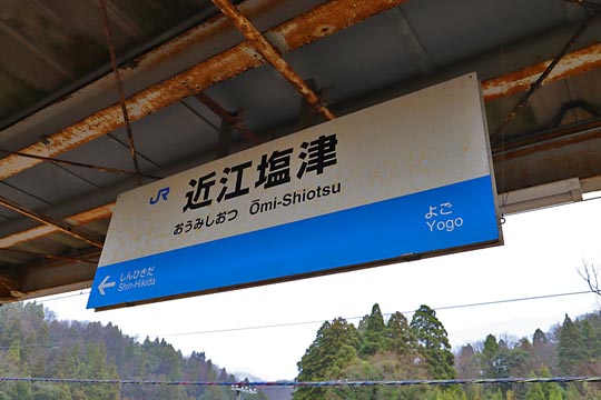次は余呉。 近江塩津駅の駅名標。 北陸本線と湖西線の合流分岐点であるこの駅は、路線別ホームとなっています。 こちら側は北陸本線ホームの駅名標。 島式のホーム両面に上下列車が停車するのですが、下り側の面には小さく新疋田方面への矢印が描かれていました。