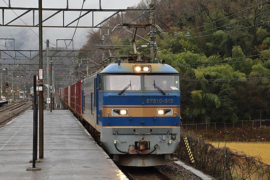 貨物列車。 次の列車待ちをしている間に、貨物列車がやって来ました。 機関車はEF510です。 交直流機ではありますが、昔の国鉄色に倣ったローズ色ではなく、直流機と同じ青いいでたちです。 元々交流電化の北陸本線でこの色の機関車を眺めると違和感がありますが、この区間。 現在は直流電化区間へと変更になっています。 それにしても、この機関車。 直流用のEF210と似たカラーリングではありますが、随分印象が異なりイカツイ感じがします。