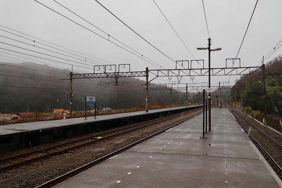 新疋田。 下り線の上をオーバークロスし、上下線の関係が元に戻ると、間もなく新疋田に到着です。 本日の予報では雪の恐れがああるとのことでしたが、雪雲の通り道であるこの付近。 地面に積雪は見られません。