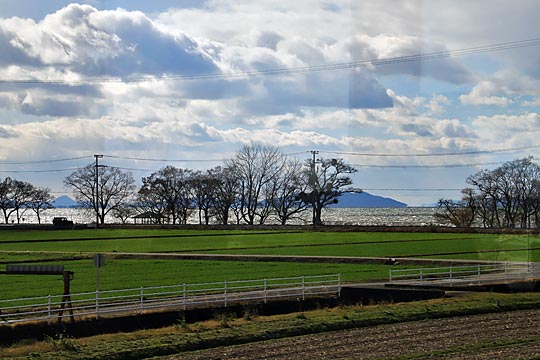 湖岸風景。 とは言え建物が無いこのあたりの風景は、昔の記憶の残像と大差ない感じがします。 湖西線のように高架ではなく、ほぼ平地を走りますので、湖を見下ろすと言う感じではありません。 しかし湖岸までやや距離があるとはいえ、間に遮るものが無いと、こんな感じで琵琶湖の湖面が眺められます。 景色は窓の外を流れてゆきますが、時間が止まっているようでもあります。