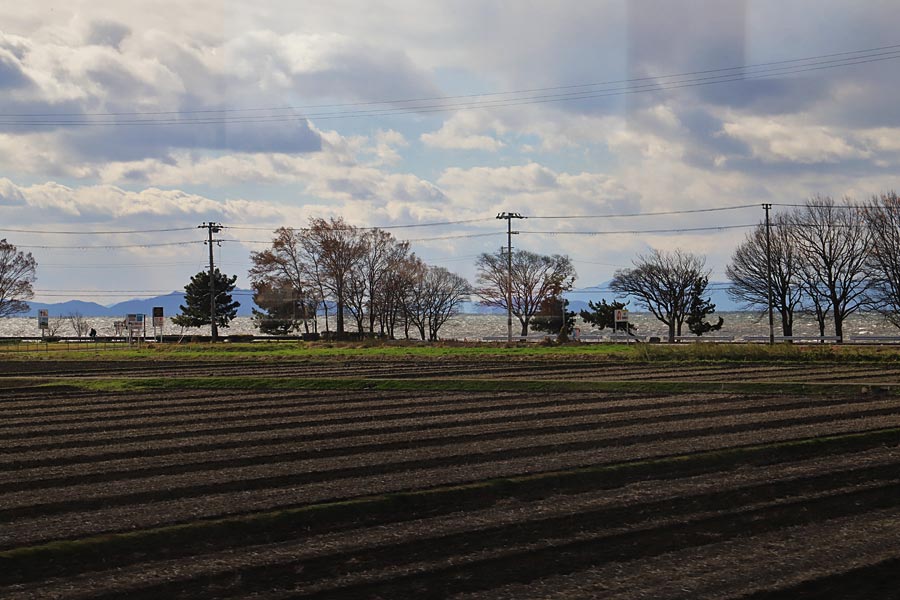 琵琶湖。 北陸本線の湖東側の区間に乗車するのは久しぶりで、前回がいつだったのか覚えていません。 おそらくは夜行急行「きたぐに」の581系か583系で通ったのが最後だと思いますが、これは夜行列車。 景色が見える昼間の列車となると、何十年も前のことかもしれません。 少なくともここ20年くらいは、北陸方面への昼間の列車は、湖西線経由のサンダーバードばかりです。