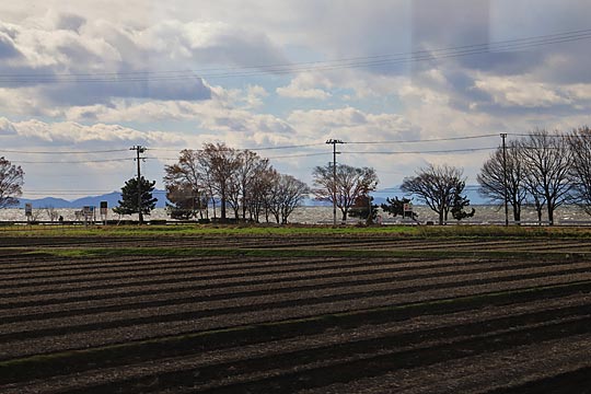 田園風景。 福井から武生にかけての田んぼの中を列車は進みます。 のどかな田園風景と言いたいところなのですが、本日はこの先、もしかすると大雪になるかもとの予報が出ています。 向こうの方の雲行きも、何だか怪しげな感じです。