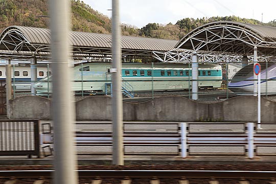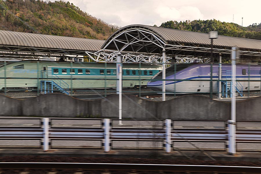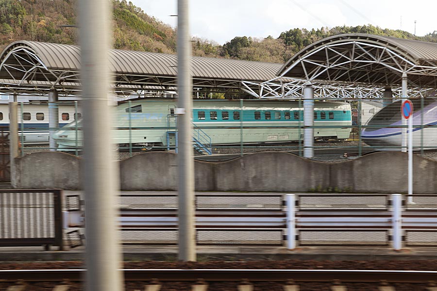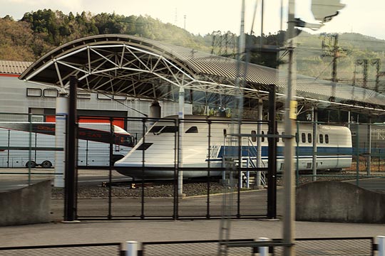 試作車両。 米原駅を出るとすぐに、こんな車両が目に入ります。 鉄道総合技術研究所の米原風洞技術センターに保存された、かつて新幹線車両の技術開発につくられた試作車たちです。 300系の登場後に更なる向上をめざし試作された300Xこと955形。 どことなく300系と700系のミックス的な感じがします。
