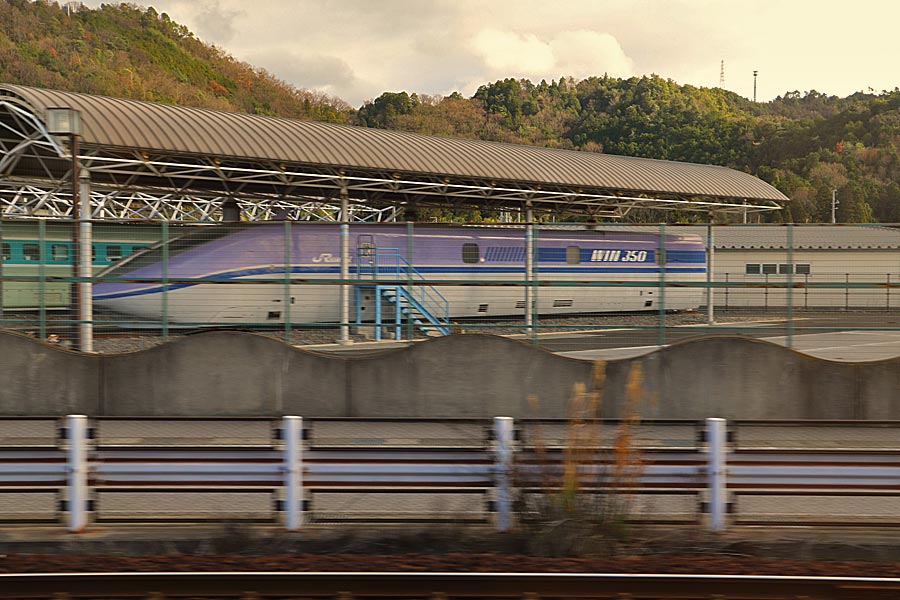 WIN350。 先頭車1両だけのWIN350. こちらも営業車両では見かけない塗装をまとっていましたが、フォルムは営業車の500系を思わせるものがあります。 JR西日本。 騒音問題がなければ、350キロ運転も不可能じゃないんでしょうね。