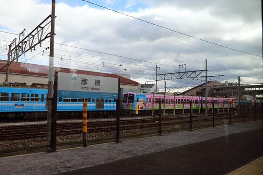 彦根。 彦根駅に到着。 隣には近江鉄道の電車が並んでいます。 かつては西武カラーの電車が多かったのですが、今ではオリジナルの派手な塗装や広告ラッピングが目を引きます。 ここで結構沢山のお客が下車。 おそらくは米原で不便な乗り換えを余儀なくされたお客が多いのではないかと思います。 そして下車した以上に沢山のお客が乗り込み、座席は8割方埋まりました。 ここまで来ると、京都大阪方面へのお客が多いのかな。