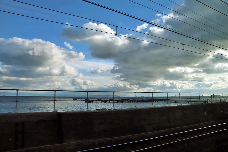 須磨浦海岸。 京阪神区間は混雑していたのカメラを出すのを控え、列車は神戸を過ぎて須磨浦海岸付近を走行中です。 複々線の路線。 現在は新快速は、山側の列車線を走りますので、一番海のそばではなく、間に複線の線路が入ります。 ほんの10メートルほどの違いではありますが、かつて153系の新快速の頃は、もっと海がすぐ近くに見えたものでした。