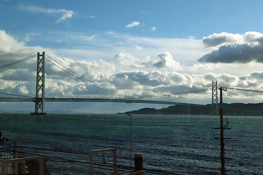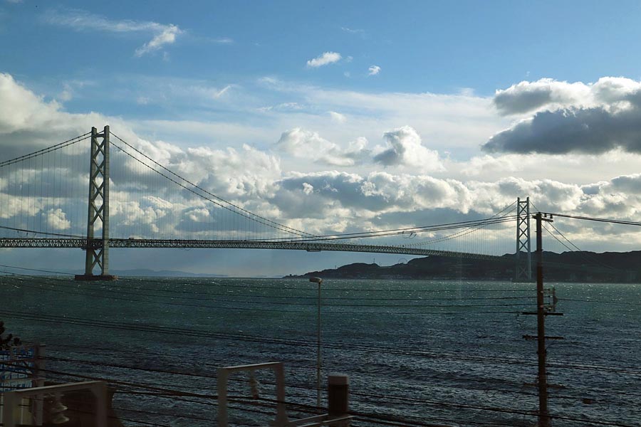 明石海峡大橋。 神戸と淡路島を結ぶ、明石海峡大橋。 山陽本線在来線は橋の下をくぐるので見応えがあります。 後ろ向きにはなりますが、車窓から写真を撮ろうとすると、このあたりが一番絵になります。