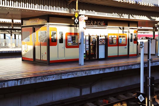 姫路。 姫路に到着しました。 反対側の上りホームにあるのは、まねきのえきそばことまねき食品の立ち食いそば店舗と駅弁売場。 こちらは姫新線に合わせたのか播但線に合わせたのか、かつての急行気動車の装いです。