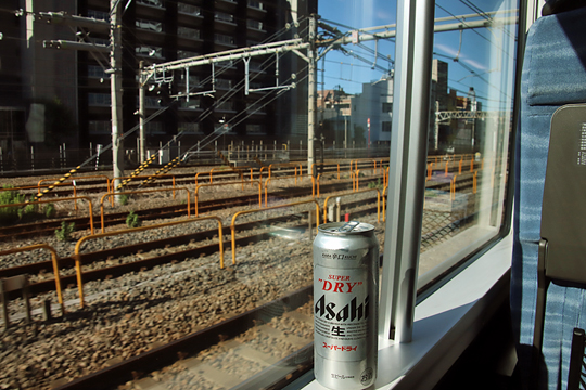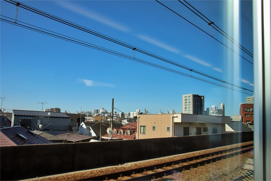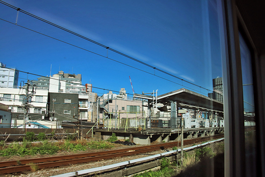 高架線。 高架線をひたすら真っ直ぐに西に向かいます。 この区間は直線の線路がずっと続く区間ですが、駅の構内では配線の関係で多少左右に揺れが入り、ビール缶が倒れないようにと注意は必要です。 昨日通過した台風の影響はなく、晴れ渡った青空です。