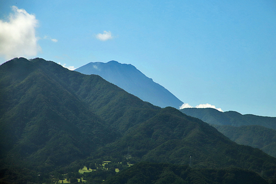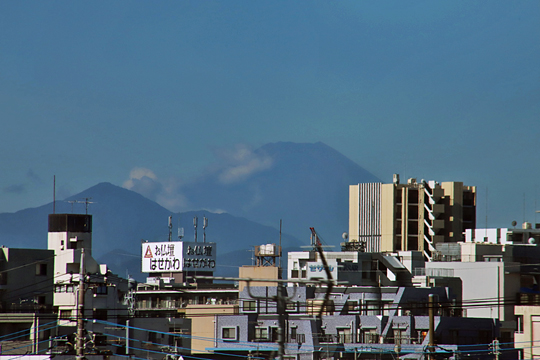 後方に。 すでに富士山が一番近いはずの所は通り過ぎていますので、斜め後方に遠ざかるばかりです。 残念ながら、スカッと抜けて車窓から眺められる場所はそれほど多くありません。