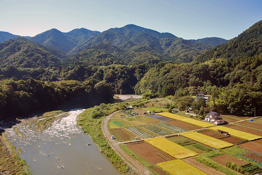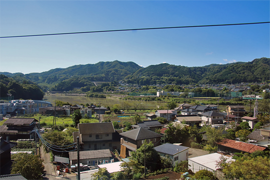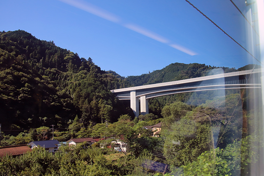 山中。 立川、八王子と停車して、高尾を過ぎると、車窓は一気に都会から山中の風景に変わります。 しかしどこに行っても、突然道路の巨大な建造物に出会うのには驚きます。