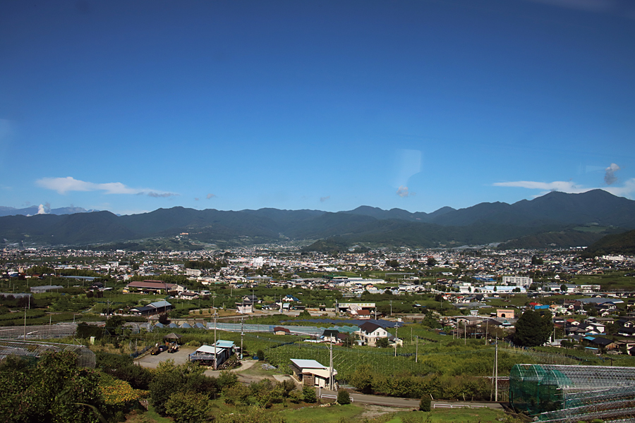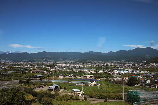 甲府。 この列車は速達タイプの「あずさ」ですので、八王子を出ると途中大月には停まらず次の停車は甲府です。 さすがに甲府が近づくと、広い盆地で平地が格段に多くなります。 ブドウはじめ果樹園も多数です。 2025年9月21日追加