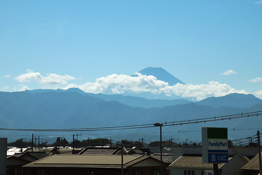 富士山。 まだ立川の手前ではありますが、本日は快晴。 遠くに富士山もくっきりと眺められます。 と言うか、富士山の北側を西に進む中央本線ではありますが、一番近いあたりでは地形の関係で、車窓からはゆっくり眺めることができません。 お天気さえ良ければ、このあたりが比較的じっくり眺められる地点ではあります。