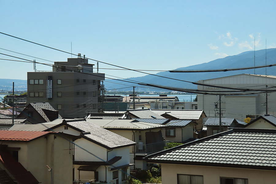 諏訪湖。 列車は諏訪湖の近くを走行中なのですが。 もう少し湖が近いと思っていたのですが、カメラを構えているのに湖面がサッパリ近くに見えません。 こんな印象だったかな? もしかすると、相模湖の印象とゴチャゴチャになっている?