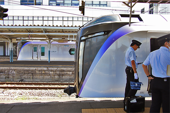 松本。 松本に到着です。 列車はここから先大糸線に乗り入れ、白馬まで向かいますが、ここで編成の後ろが切り離し。 乗務員も交代し、稀少になった車内販売もここまでです。 本日は私もここ松本でこの列車からは下車します。 このページのトップへ